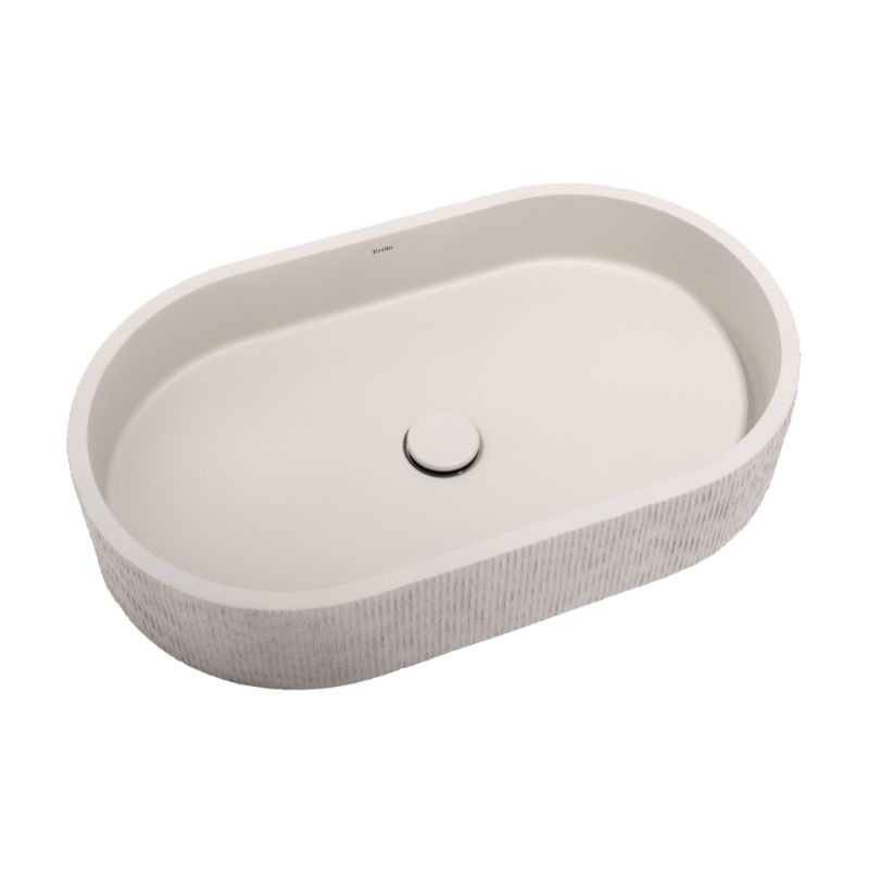 The Marathi Bark Concrete Basin combines smooth curves with bark-textured detailing that shifts with light.