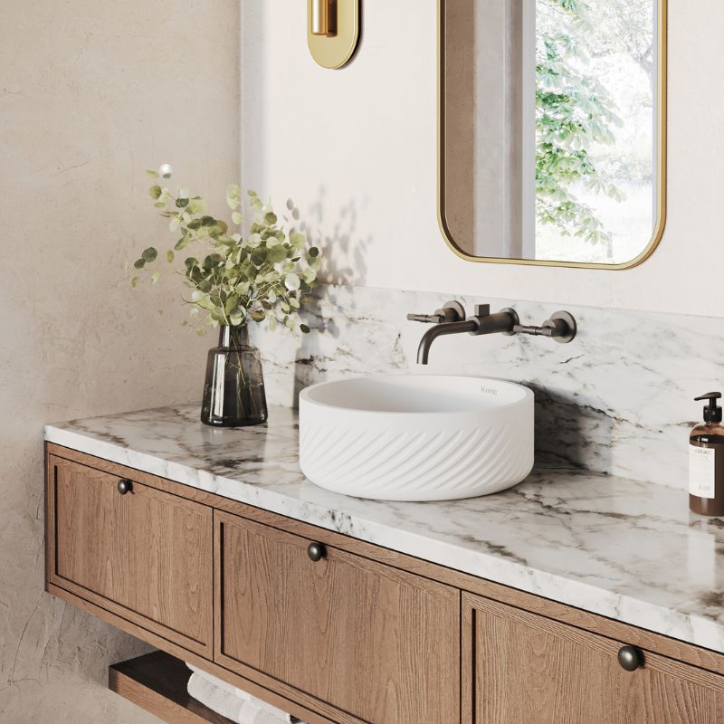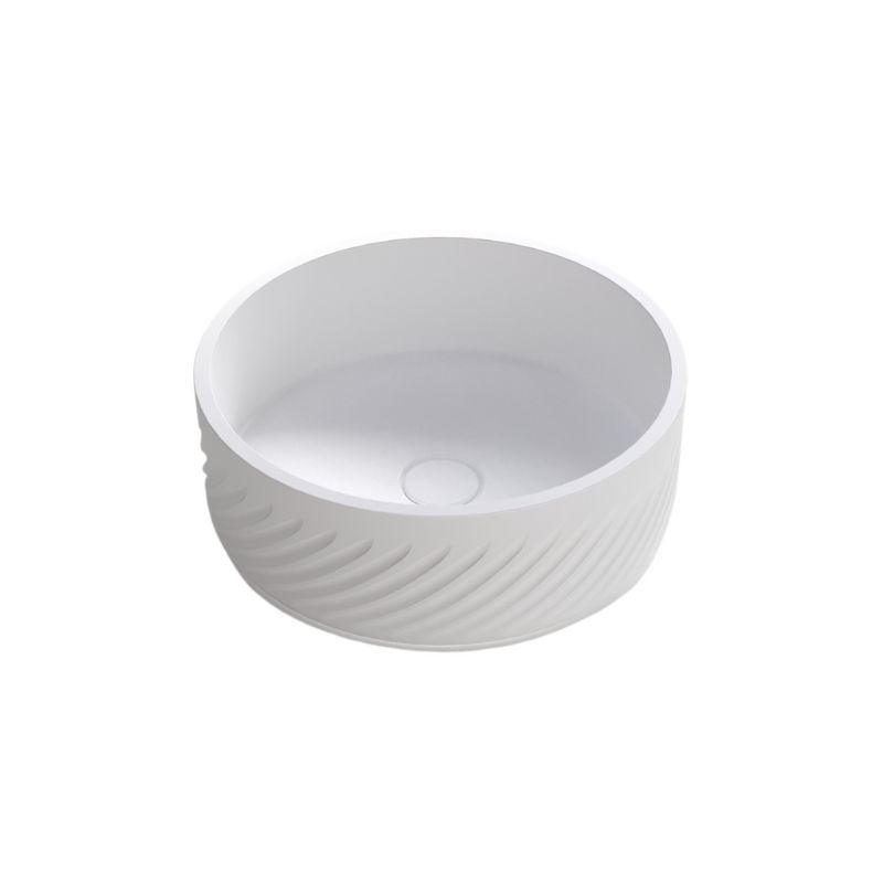 The Margarites Concrete Basin features a deeply fluted exterior and symmetrical form that adds architectural texture.